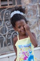 Cubaanse jongedame met een geel prinsessenshirt 'Princesas' die lachend in de lens kijkt