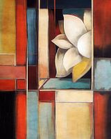 Abstracte kleurrijke kunst met een lotusbloem in een kubistische stijl.