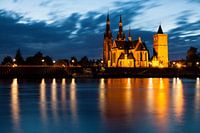 Cuijk met de mooi verlichte Sint-Martinuskerk en weerspiegeling in het water van de Maas. Deze foto is gemaakt in de schemering tijdens het blauwe uur.