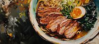 Culinaire Kunst | Ramen Noodle Art - Dit levendige werk toont een smakelijk tafereel van ramen, een populair Japans noodlegerecht, met sappig ogend vlees, een zachtgekookt ei, en verse groenten. De expressieve penseelstreken en rijke textuur brengen de ingrediënten tot leven, terwijl een harmonieuze balans van warme en donkere tinten het geheel afmaakt.