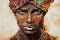 Een fascinerend portret dat fascineert met intense ogen en sierlijke, kleurrijke decoraties. De majestueuze tulband en de fijne details van de gezichtsschildering brengen een diepe culturele betekenis over. Dit kunstwerk is perfect voor de woonkamer, waar het een gesprek kan stimuleren en een warme, uitnodigende sfeer kan creëren.