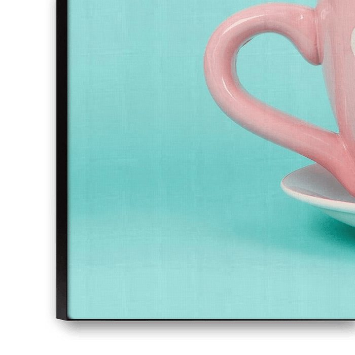 English bulldog puppy facing the camera sitting in a pink and white dotted cup and saucer on a turquoise blue background