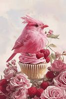 Een vleugje dromerigheid, een druppeltje zoetigheid. 'Cupcake Vogel met Frambozen' brengt twee werelden samen: de lichtheid van een roze zangvogel en de verleiding van een perfect versierde cupcake. Het beeld is als een moderne fabel in pastel, waarin natuur en patisserie elkaar ontmoeten in een betoverende compositie.