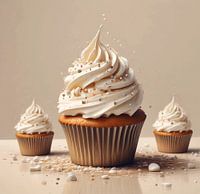 een stilleven van een drietal cup cakes cake met een slagroom dot wip cream en speels stukjes sprinkels zoet eroverheen op de top gedecoreerd op een beige lichte achtergrond.