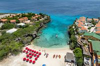 Lagun van boven. Deze drone-opname, gemaakt met een professionele drone, legt de rustige schoonheid van deze knusse baai op Curaçao feilloos vast. Omringd door kliffen, helderblauw water en dobberende vissersbootjes, lijkt de tijd hier even stil te staan.
