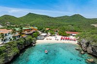 Lagun van boven. Deze drone-opname, gemaakt met een professionele drone, legt de rustige schoonheid van deze knusse baai op Curaçao feilloos vast. Omringd door kliffen, helderblauw water en dobberende vissersbootjes, lijkt de tijd hier even stil te staan.
