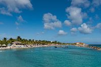 Seaquarium beach op Curacao. De foto is genomen in de richting van beachbar Wet 'n Wild en Mambo beach. De lagune toont het mooie tropische azuurblauwe water.