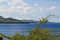De ongerepte kustlijn van het westen van Curacao waar doornstruiken het land groen kleuren.