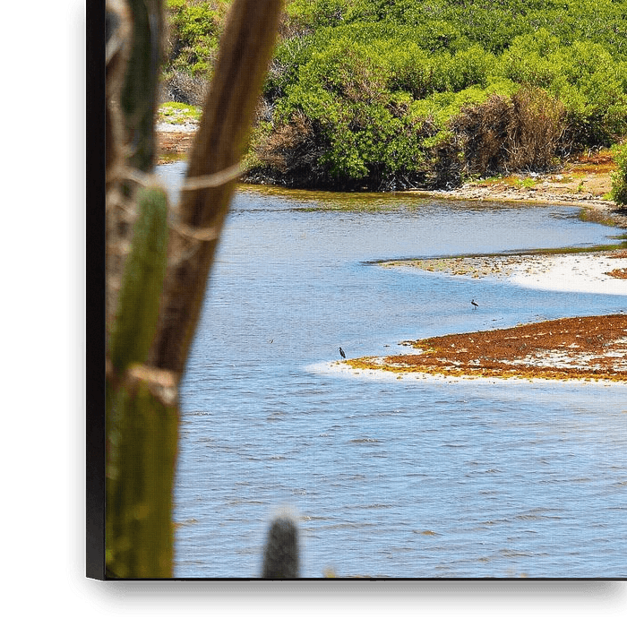 Binnenwater met op de achtergrond een landhuis. De cactussen maken een fraai doorkijkje naar deze zoutpannen.