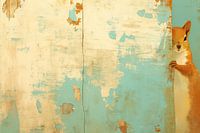 Curious Climber - Dit dieren schilderij toont een charmante eekhoorn die zich vastklampt aan een verweerde, blauw en beige houten oppervlakte met afbladderende verf, waardoor het een rustiek en natuurlijk gevoel krijgt.