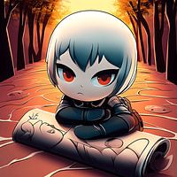 "Course Laying" vangt de surrealistische samensmelting van onschuld en strategische vastberadenheid in een prachtig gestileerde chibi-krijger. Tegen de achtergrond van een gloeiend, dromerig bos in gesmolten zonsondergangtinten ligt deze vastberaden figuur op een rol - misschien een strijdplan, misschien een profetie - bedekt met mysterieuze figuren en onbekende kaarten.