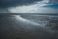 Een dramatisch strandbeeld van Ameland bij laag water, met een opvallende slingerende lijn die als leidraad door het landschap loopt. De donkere, moody wolkenlucht boven het uitgestrekte strand geeft het beeld een mysterieuze en melancholische sfeer, alsof er elk moment regen kan vallen. Dit contrast tussen het rustige water en de…