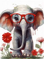 Deze illustratie betovert met zijn speelse uitstraling, waarin een schattig Pixar-actig olifantje centraal staat. Het olifantje draagt een grappige rode bril op zijn kleine snuit. Het is omringd door levendige rode bloemen die zijn vrolijke karakter benadrukken.