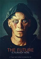 Een sombere compositie van de toekomst die de futuristische mens van morgen op de voorgrond plaatst.