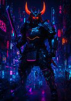 Een cybernetische samoerai torent boven de neonverlichte straten uit. Zijn gehoornde pantser en gloeiende lemmet symboliseren dominantie en angst.