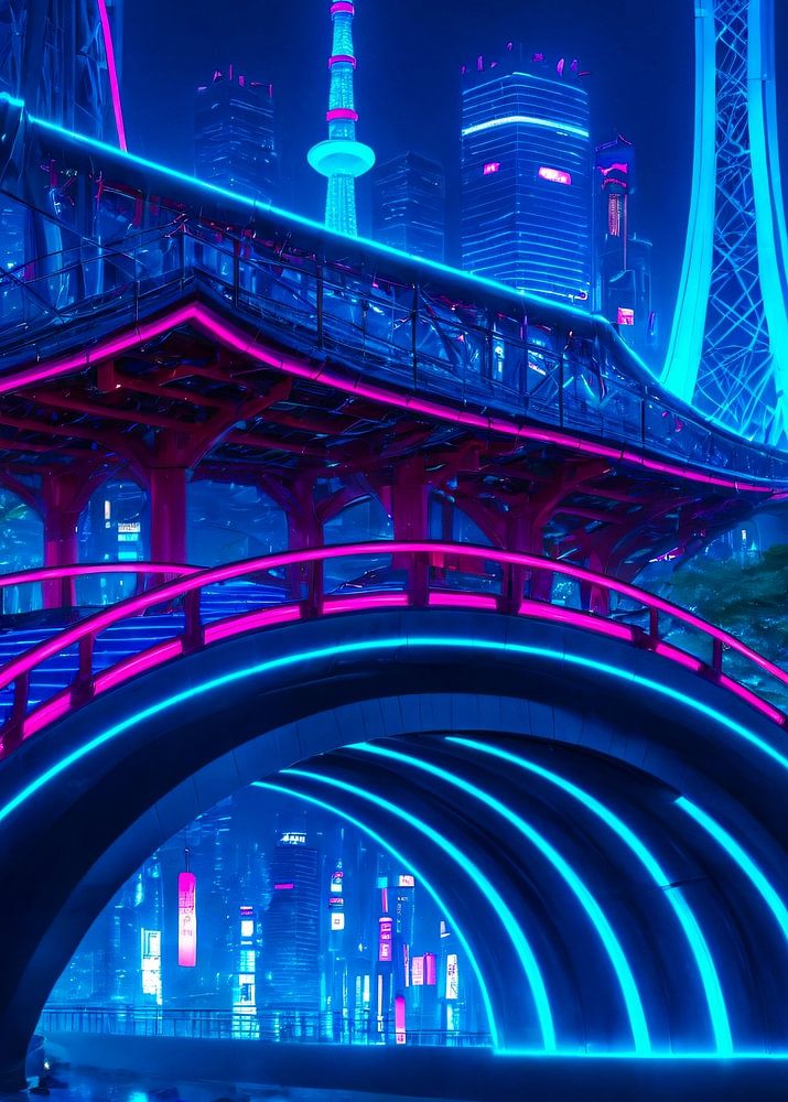 Een verlichte boog overspant het neonwater van de stad en symboliseert het pad tussen traditie en toekomst. Onder de gloeiende bogen rimpelen reflecties als portalen naar andere dimensies, die dwaalgasten begeleiden naar het hart van het Neon Shogunaat.