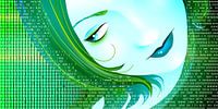 Deze vectorafbeelding toont een gestileerd portret van een vrouw met één open oog die de kijker recht aankijkt. De figuur is in koele blauwe en groene tinten, het haar vloeit in gebogen lijnen rond het gezicht. Groene binaire codeletters lopen verticaal over de achtergrond - een visueel citaat uit de digitale wereld dat associaties oproept met datastromen, netwerken en kunstmatige intelligentie.
