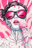 Dit levendige cyberpunk kunstwerk toont een futuristische vrouwelijke cyborg die geniet van een smeltend roze ijshoorntje, haar slanke metalen lichaam omlijst door speelse wervelingen van aardbeientinten.