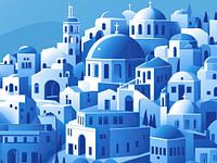 Dit grafische schilderij in blauwtinten vangt de architecturale schoonheid van de Cycladen in Griekenland op een gestileerde en repetitieve manier. De witte kerkjes met hun karakteristieke blauwe koepels en de kubusvormige huisjes worden herhaaldelijk afgebeeld in een strak patroon, waardoor het geheel een ritmisch en bijna abstract…