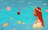 Portret van een jonge vrouw in een imaginair landschap met vissen en vogels.