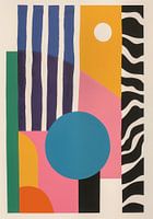 Een modern abstract kunstwerk dat speelt met levendige kleuren en heldere vormen. Centraal staat een grote blauwe cirkel omringd door lijnen, vlakken en geometrische elementen in geel, roze, zwart, oranje en wit. Verticale strepen links en gebogen lijnen rechts geven het werk beweging en diepte. Een harmonieuze balans tussen dynamiek en…