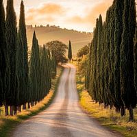 Een zacht, kronkelend pad baant zich een weg door een betoverend panorama, geflankeerd door majestueuze cipressen die eruitzien als groene schildwachten. Het warme licht van de ondergaande zon baadt het landschap in gouden tinten en creëert een magische sfeer die uitnodigt om te dromen. Hier begint de reis naar het hart van Toscane.