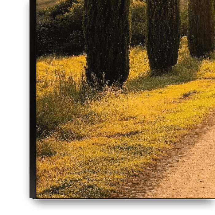 Gouden zonnestralen breken door het glooiende heuvellandschap, terwijl majestueuze cipressen als schildwachten langs de kronkelende laan staan. Het pad slingert naar het onbekende, omringd door weelderig groen, en nodigt je uit voor een reis naar de pittoreske idylle van Toscane, waar tijd en ruimte samensmelten.