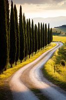 Een zacht, stoffig pad baant zich een weg door het idyllische landschap tussen majestueuze cipressen. De warme tinten van het zonlicht omhullen het landschap en geven het een bijna magische uitstraling. Deze uitnodigende laan belooft nieuwe avonturen en laat de kijker dromen van de geheimen van de Toscaanse heuvels.