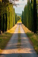 Een droom van groen strekt zich voor de kijker uit: een smal pad omzoomd door majestueuze, torenhoge cipressen die er uitzien als eervolle schildwachten. Het zachte licht van de ondergaande zon kust de aarde en roept lange schaduwen op, terwijl het pad in de verte voert en uitnodigt om nieuwe horizonten te ontdekken.