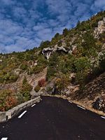 Zicht op de geasfalteerde, zwartgekleurde landweg D942 op een zonnige dag in de herfst, slingerend langs kliffen door de kloof van de Gorges de la Nesque in de bergen van de Vaucluse in de Provence in het zuiden van Frankrijk.