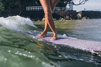 Female surfer is dancing on her longboard surfboard in Sri Lanka