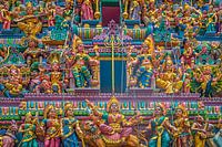 Detail van een kleurrijke hindoetempel in Singapore, versierd met vele figuren.