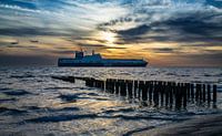 Een DFDS veerboot passeerde de kustlijn van Zoutelande tijdens een mooie zonsondergang. De golfbreker op de voorgrond zorgde voor een mooie dieptewerking in het beeld.