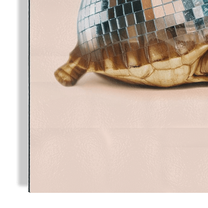 I'm coming up so you better get this party started! Modern pop-art humor ontwerp "Disco Turtle" surrealistische foto collage van dieren in roze pastelkleuren. Maak elke muur fun!