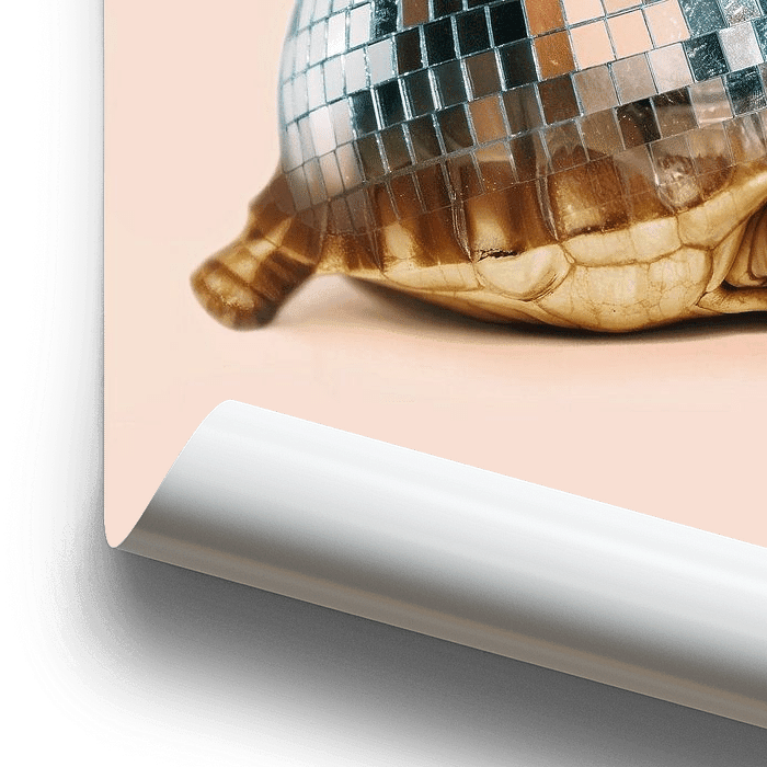 I'm coming up so you better get this party started! Modern pop-art humor ontwerp "Disco Turtle" surrealistische foto collage van dieren in roze pastelkleuren. Maak elke muur fun!