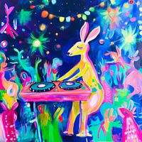Op een levendige, kleurrijke nacht danst een geel konijn op de draaitafels, omringd door opgewonden dierenvriendjes. Felle lichten en vrolijke kleuren creëren een feestelijke sfeer terwijl de personages enthousiast meedoen aan de festiviteiten. Het beeld straalt een levendige energie uit die meteen indruk maakt en de vreugde van muziek en gemeenschap voelbaar maakt.