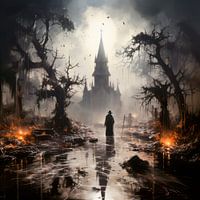 Nachtmerrieachtige sfeer bij een oud herenhuis op een kerkhof met duivels vuur, rotte bomen en een griezelig figuur. Donkere digitale kunst in gotische stijl. Een populair ontwerp, niet alleen voor Halloween. Het werk is gemaakt in samenwerking met kunstmatige intelligentie.