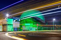 De groen verlichte koepel van DOT in de stad Groningen contrasteert met het rode verkeersbord ; 'verboden voor alle verkeer'. De lichtstrepen komen van een voorbij rijdende stadsbus. Voorheen stond dit gebouw bekend als "Infoversum". De foto is gemaakt in het najaar van 2013.