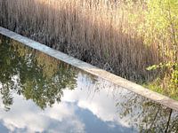 Een betonrand in het water van het Defensiekunstwerk waterwerken Westervoort, vormt een strakke scheiding tussen de begroeiing van voornamelijk rietsoorten en het water. Het spiegelgladde windstille water spiegelt een verrassend heldere reflectie van riet, struiken en de toppen van bomen…