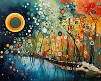 Dag en Nacht - Dit dynamische kunstwerk combineert abstracte elementen met een suggestie van een natuurtafereel. Levendige cirkelvormen en lijnen in warme oranje en koude blauwe tinten geven een speels energiek contrast, suggererend naar de cyclus van dag en nacht.