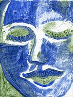 Portret van een gezicht in abstractie weergegeven. Het schilderij heeft aardse groen en blauw tinten.