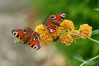 Dagpauwogen zonnebadend op zomerlila's
