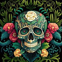 Een schedel versierd met planten en bloemen tegen een botanische achtergrond. Deze folkloristische doodshoofd print herinnert aan de dag van de doden die vooral in Mexico wordt gevierd.