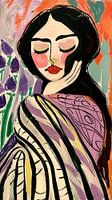 Haar ogen zijn gesloten, en haar gezichtsuitdrukking weerspiegelt een innerlijke sereniteit of een moment van diepe overpeinzing. De stijl van het schilderij is expressief en abstract, met gewaagd gebruik van kleuren en vormen die emotie en persoonlijkheid uitstralen. De vrouw draagt een veelkleurig gewaad met patronen die dynamisch tegen een levendige, kleurrijke achtergrond afsteken. De achtergrond zelf is een mengelmoes van warme oranje en koele paarse tinten, wat een krachtig visueel contrast vormt. De lijnen zijn dik en vloeiend, wat beweging en een bijna dromerige kwaliteit aan het beeld toevoegt.