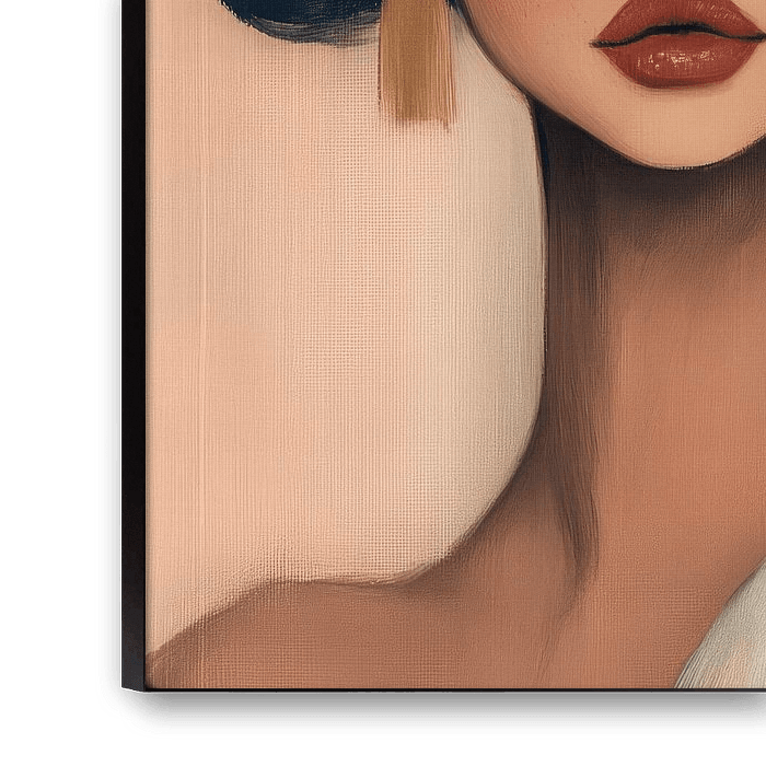 Modern portret van een jonge vrouw met bloem in het haar in pastelkleuren. In blauw, terracotta en wit. Een bijzondere blikvanger voor je interieur! Kies zelf het formaat en materiaal bij dit werk en maak het helemaal naar wens.