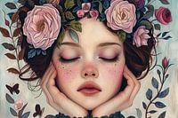 Meisje met gesloten ogen en rozen in het haar, met de titel "Dagdromer". Kies zelf het formaat en materiaal bij dit werk en maak haar helemaal passend voor jouw interieur. Een bijzondere blikvanger!
