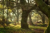 Kleine knoestige eikenbomen in een klein bosgebied dat opstoomt wanneer warm zonlicht de vochtige bosgrond ontmoet. De sfeer is daardoor bijna magisch