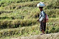 In de prachtige rijstterrassen van Maligcong, op de Filippijnen, loopt een boer langzaam onder de felle zon met een grote witte zak op zijn hoofd. Zijn perfecte balans getuigt van zijn ervaring en kracht, terwijl hij zich een weg baant langs de smalle dijken die de rijstpercelen van elkaar scheiden. Dit groene landschap, gevormd door generaties boeren, illustreert het harde werk dat nodig is om deze velden in volle productie te houden. Omringd door mistige bergen en uitgestrekte watervlakten die de lucht weerspiegelen, geeft dit moment de essentie weer van het plattelandsleven op de Filippijnen. Elke dag transporteren boeren gewassen of apparatuur over deze rijstvelden, waarbij ze eeuwenoude rijstteelttechnieken in stand houden. Het contrast tussen het oogverblindende wit van de zak en de rijke groene tinten eromheen benadrukt de harmonie tussen mens en natuur. Deze scène vertegenwoordigt niet alleen hard werken, maar ook de veerkracht en eenvoud van het leven in deze spectaculaire landschappen.