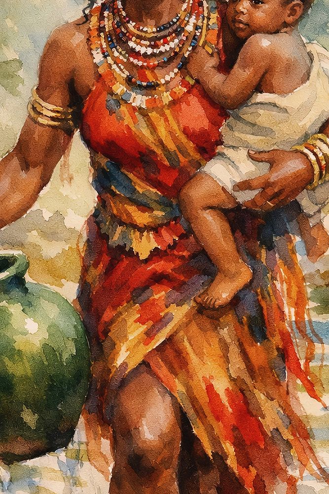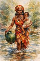 Dit levendige schilderij, uitgevoerd in een warme en expressieve stijl vangt een intiem en krachtig moment uit het dagelijks leven. Centraal staat een stralende Afrikaanse vrouw die met een natuurlijke gratie door een ondiepe rivier waadt. Ze draagt een kind stevig tegen zich aan en houdt in haar andere hand een grote, groene kruik vast…