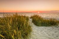 Het is prachtig om te genieten van de romantische stilte aan zee! Op het strand van de Oostzee zakt de zon langzaam in de horizon.